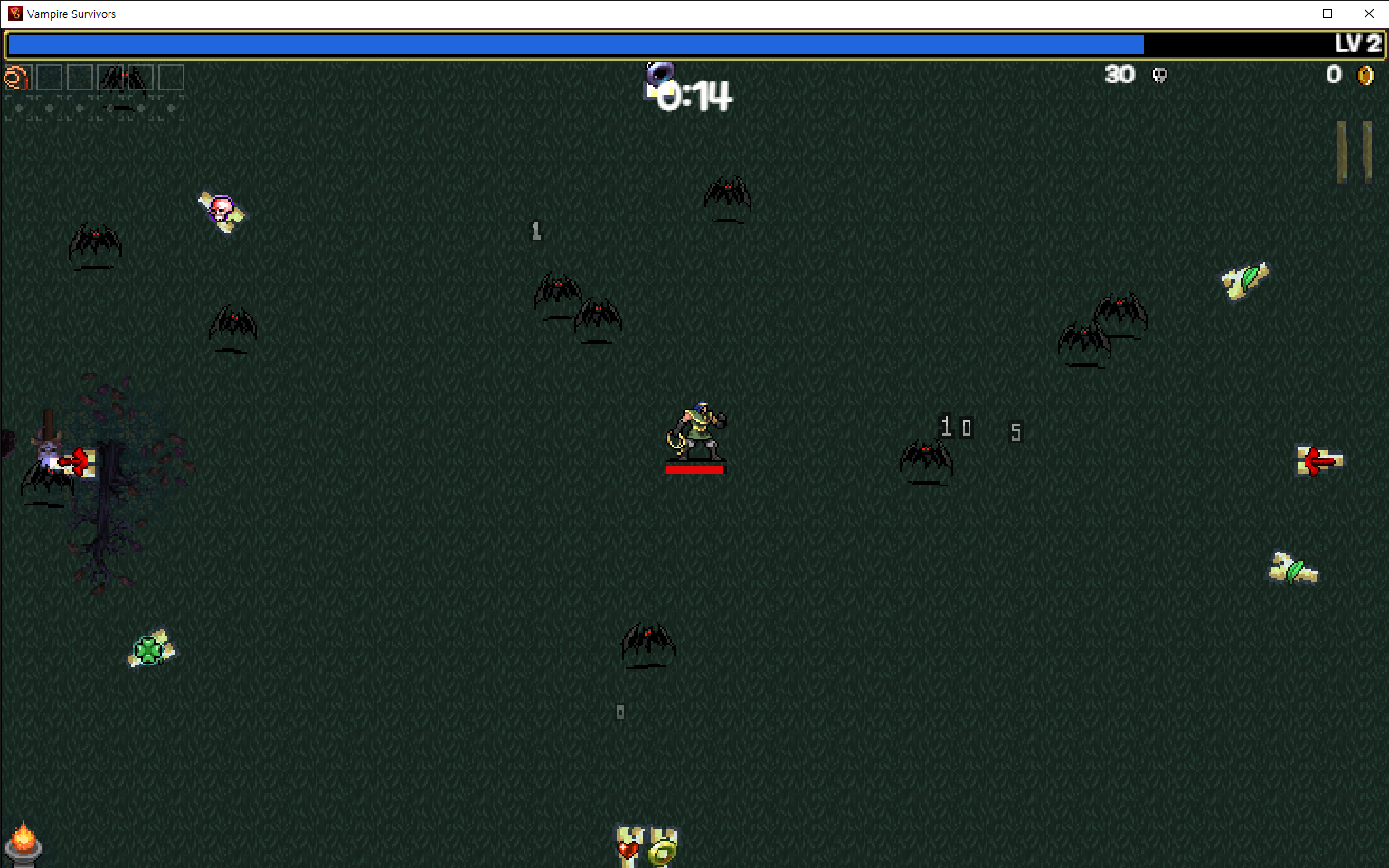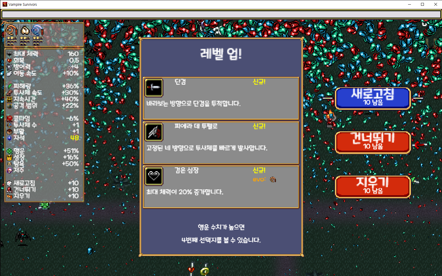 적을 쓰러뜨릴 때마다 경험치 보석이 드랍되며 이를 획득하고 레벨을 올리면 위와 같이 장비 선택창이 뜬다. 플레이어는 레벨 업당 한 번 새 장비를 구입하거나 동일한 장비를 선택하고 강화할 수 있습니다.