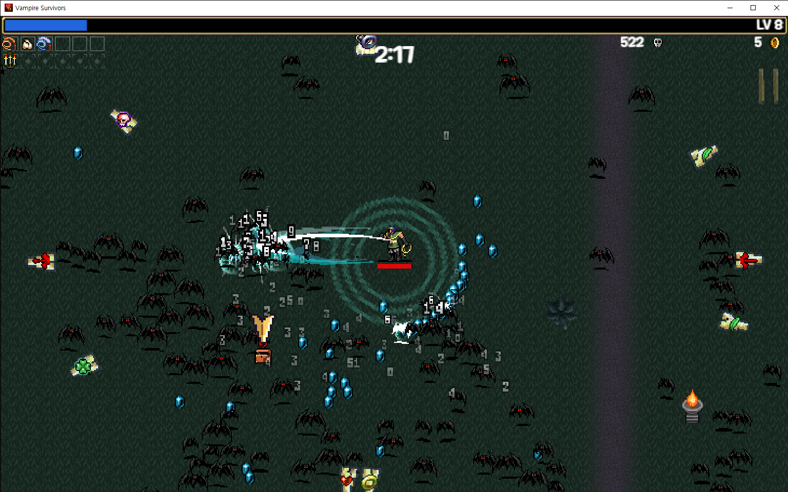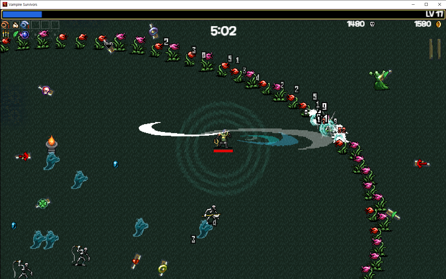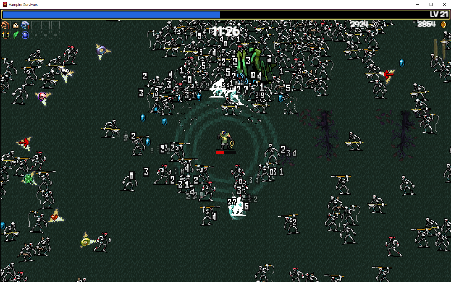 플레이어는 지속적으로 무기를 획득하고 업그레이드하면서 적의 파도에서 살아남아야 합니다. 처음에는 약한 적들이 드물게 모이지만, 시간이 지날수록 많은 수의 적들이 쌓입니다.