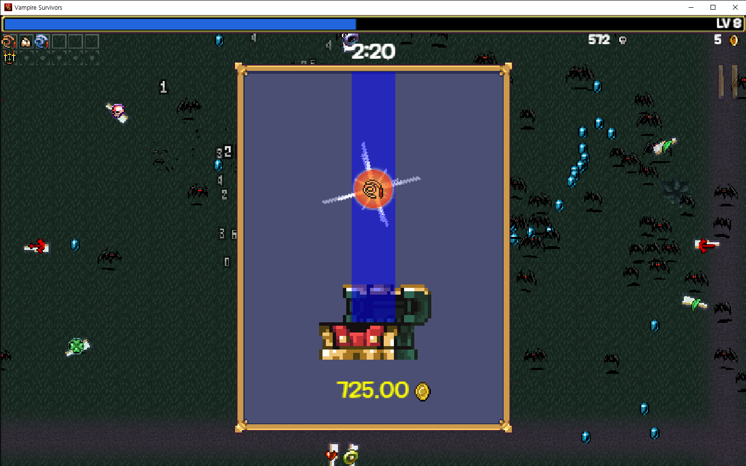 보물 상자를 먹으면 현재 장비 중 하나가 무작위로 드러납니다. 무기를 최대 레벨까지 완전히 강화하고 콤보에 맞는 장신구를 갖추면 해당 무기가 진화합니다. 보통은 1개가 나오지만 운이 좋으면 잭팟 효과로 5개의 아이템을 얻을 수 있다.