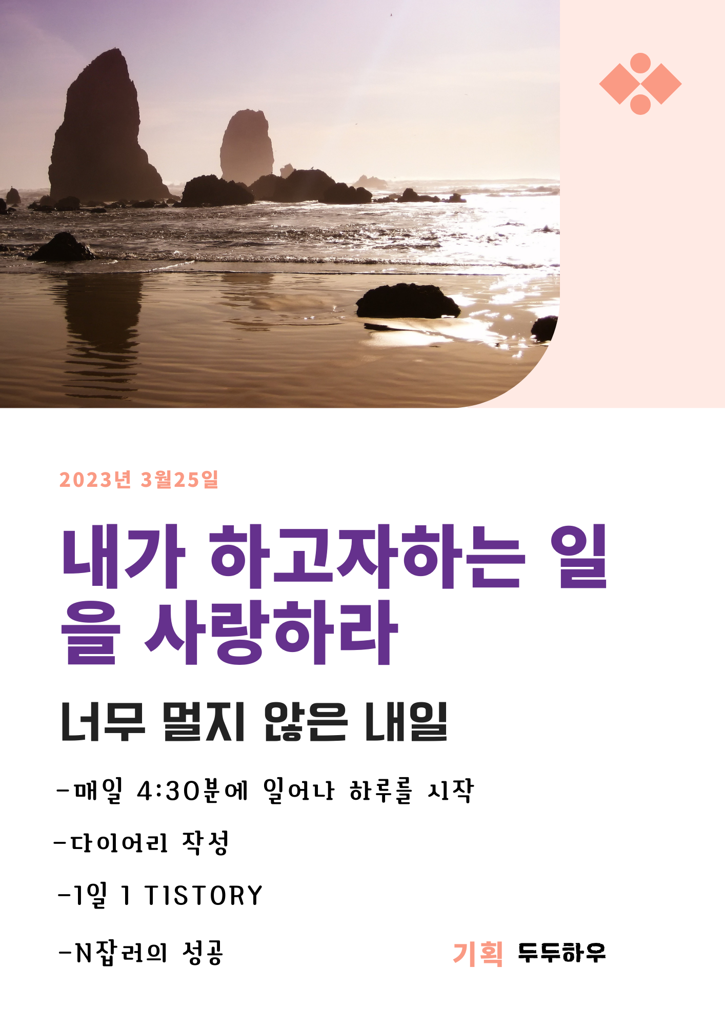 2023년 3월 25일부터 2024년 3월 24일까지 TISTORY를 찾아주시는 모든 분들과 공감하고 목표 달성을 위한 365가지 기여와 동기를 공유하겠습니다.