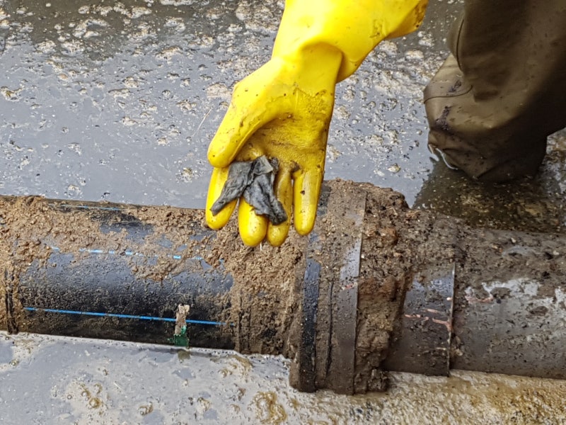 전원을 켜자마자 내부의 잔해물이 파이프 밖으로 흘러나오기 시작합니다. 배관에서 흘러나오는 이물질을 확인해보니 기름슬러지, 음식물 쓰레기, 물티슈 등 각종 오염물질이 배관 내부를 막고 있는 것을 발견했습니다. 큰 잔해물이 떠오를 것입니다. 집게를 이용해 뽑아서 떼어냈고, 작은 조각들은 흡입기를 이용해 흡입해 나갔습니다.