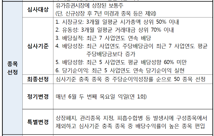 추적 지수는 “KOSPI Dividend Growth 50″입니다. 코스피에 상장된 주식에 대해 한국거래소에서 산출하는 지수입니다. 국내에서 지수를 산정하는 기업은 대부분 정부기관인 한국거래소와 민간단체인 에프앤가이드다. 한국거래소는 지수의 종류가 많지는 않지만 대표적인 지수를 산출해 발행하고 있으며, FnGuide는 다양한 지수를 보유하고 있습니다.